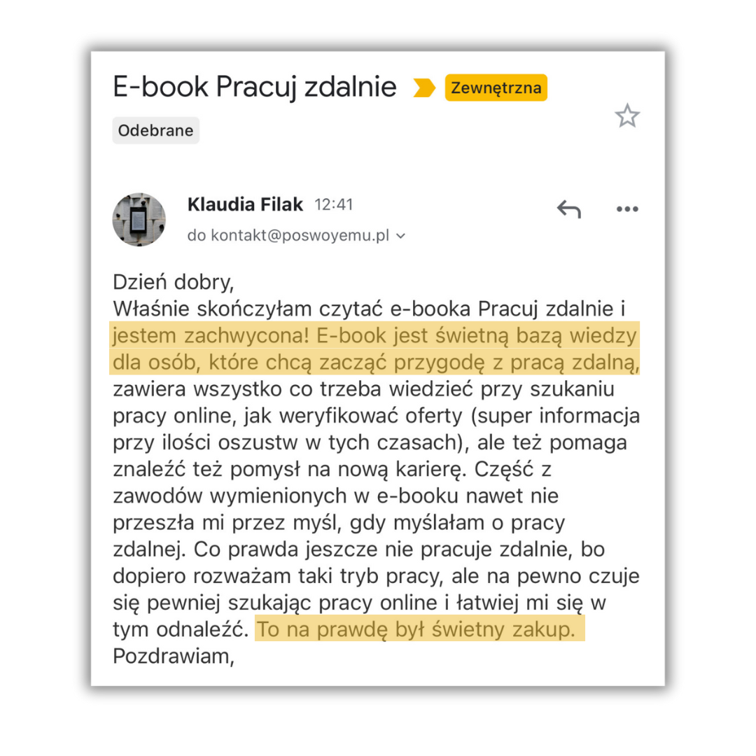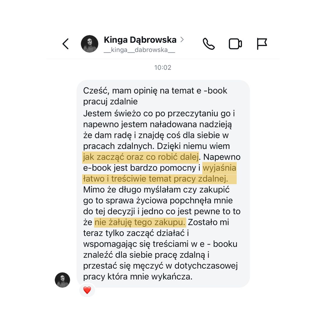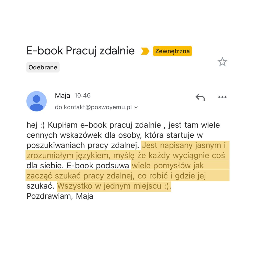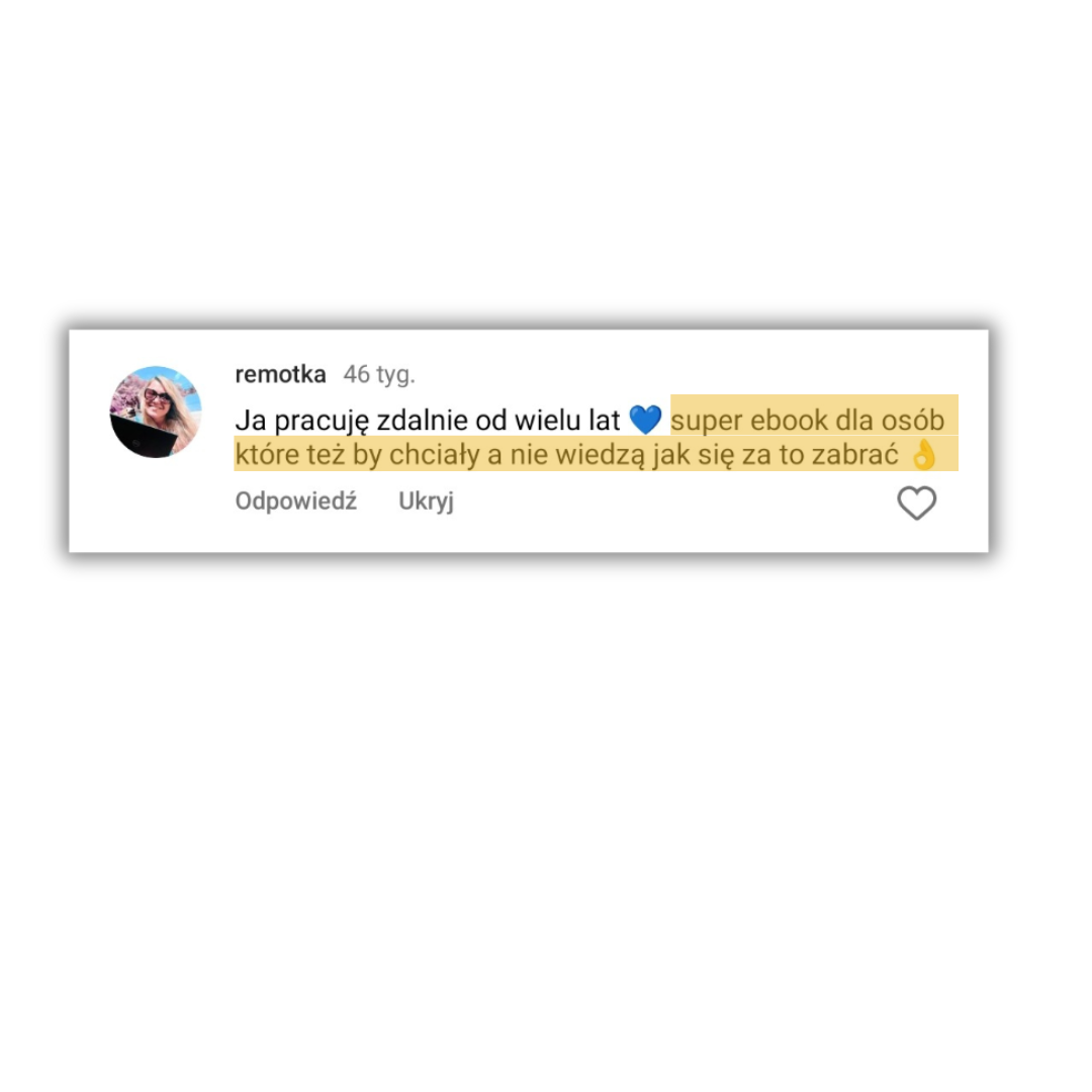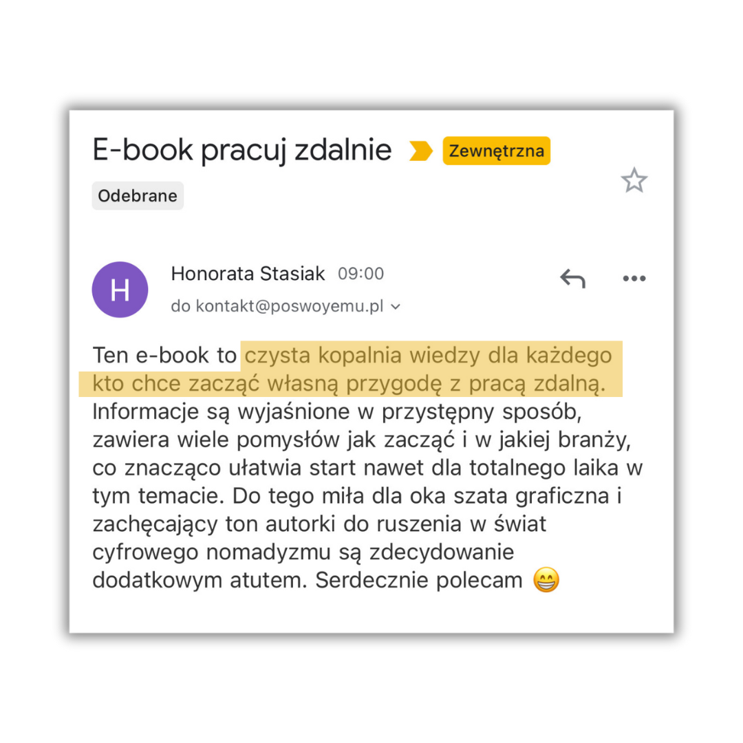 Przygotowałam dla Ciebie e-booka, w którym bazując na swoim własnym doświadczeniu (tak – ja też wcześniej pracowałam w stacjonarnej pracy), pracy indywidualnej z klientkami krok po kroku wyjaśniam m.in.: